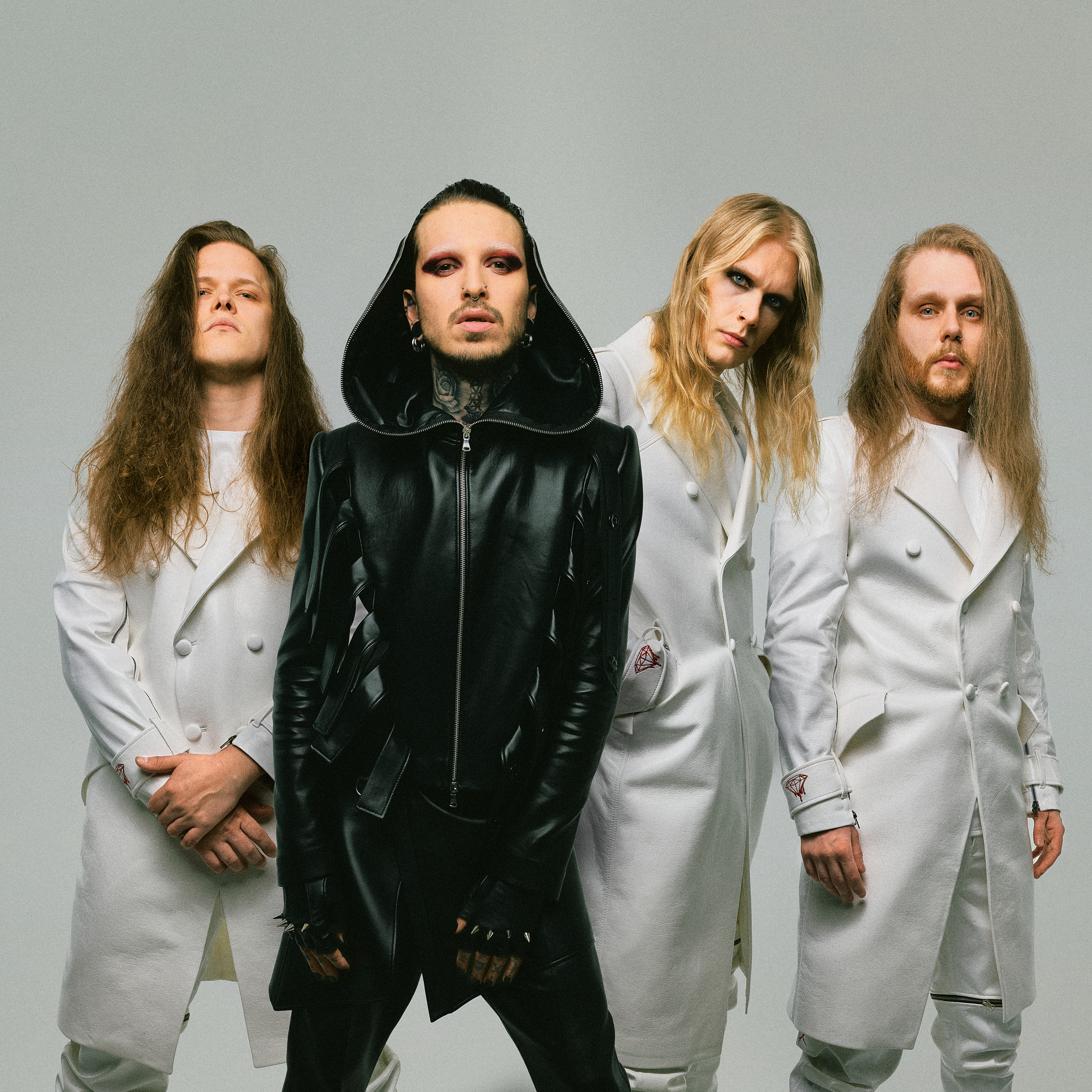 Person with long dark hair wearing a black leather jacket, holding another leather jacket in front of their lower body, standing against a plain gray background.
